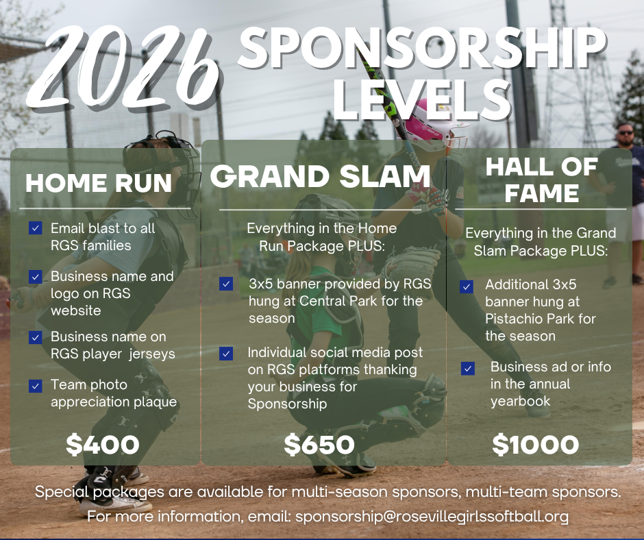 Sponsorship opportunities are outlined below. If you have any questions, please email the League Sponsorship Coordinator at: Sponsorship@rosevillegirlssoftball.org. We look forward to partnering with you to make Roseville Girls Softball a continued success.