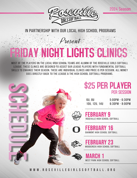 Most of the players on the local high school teams are alumni of the Roseville Girls Softball League. These clinics are designed to assist our league players with fundamental softball skills to enhance their season. These are individual clinics and the price is per session. These sessions are used as fundraisers for the local high school softball programs and our local league.